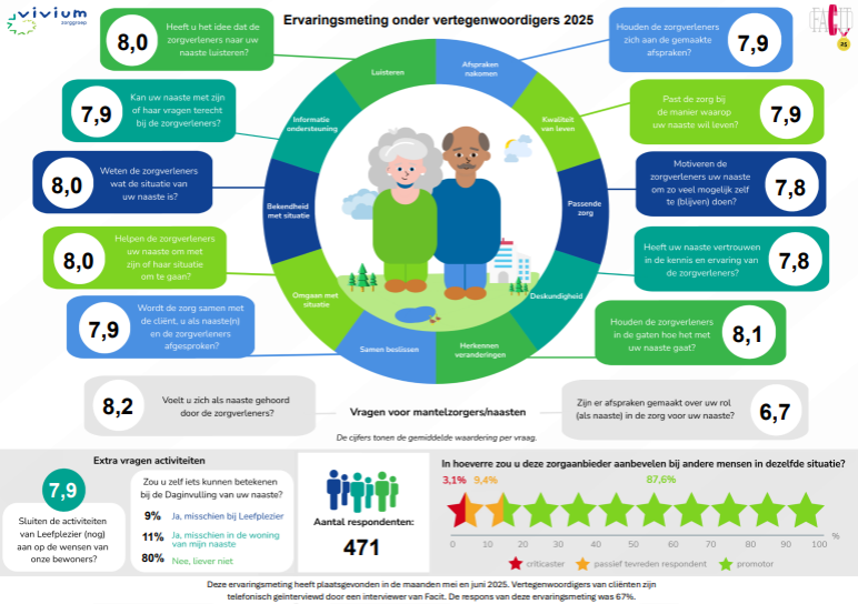 Binnen Vivium vinden we ervaringen van cliënten met de zorg- en dienstverlening heel belangrijk. In 2025 is het, ondanks de toegenomen krapte op de arbeidsmarkt en het steeds groter wordende appèl dat we op onze professionals doen gelukt om mooie resultaten te behalen in de cliëntervaringsonderzoeken. We zijn trots op de behaalde resultaten. In 2026 zetten we ons in om deze waardering te behouden.