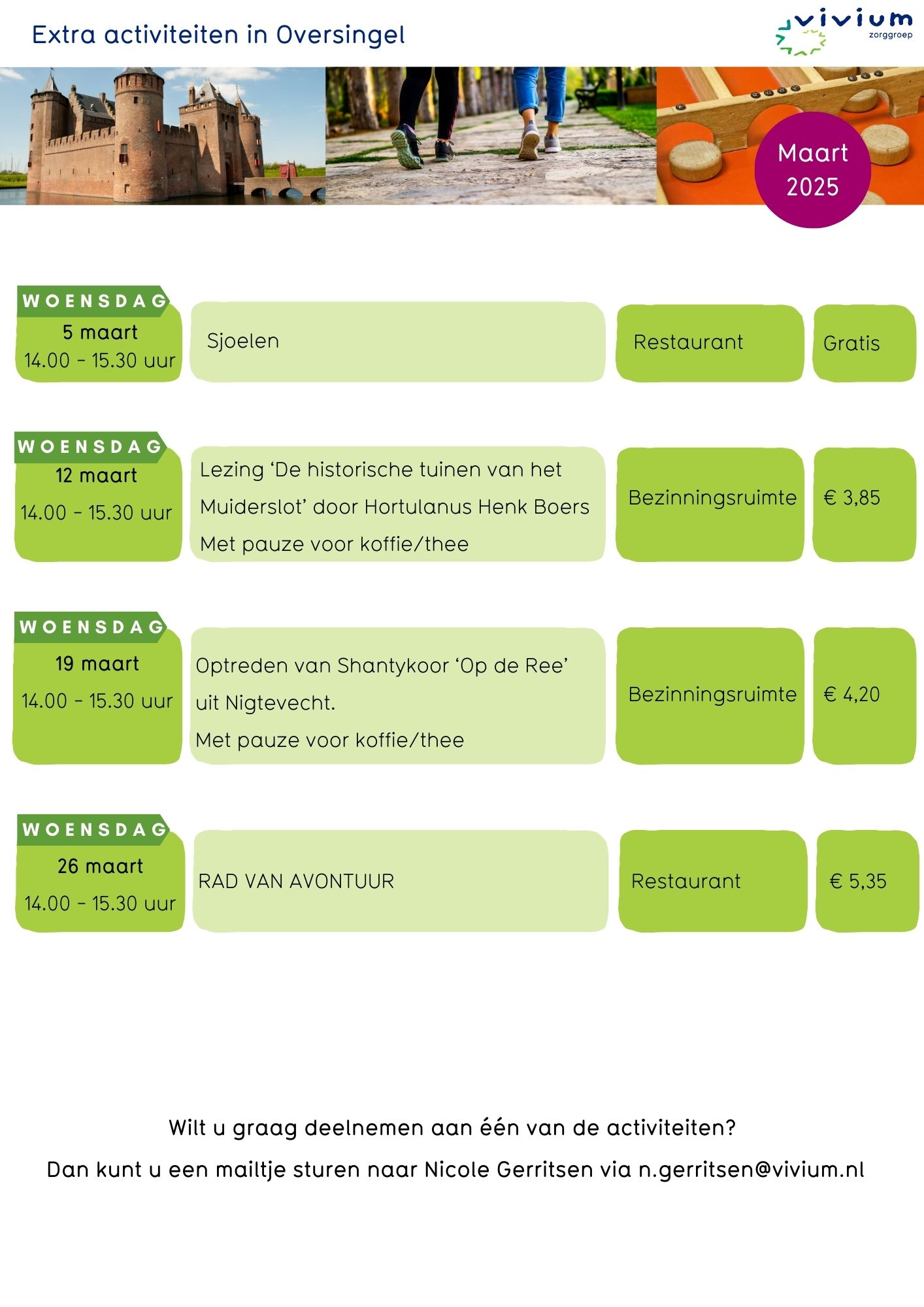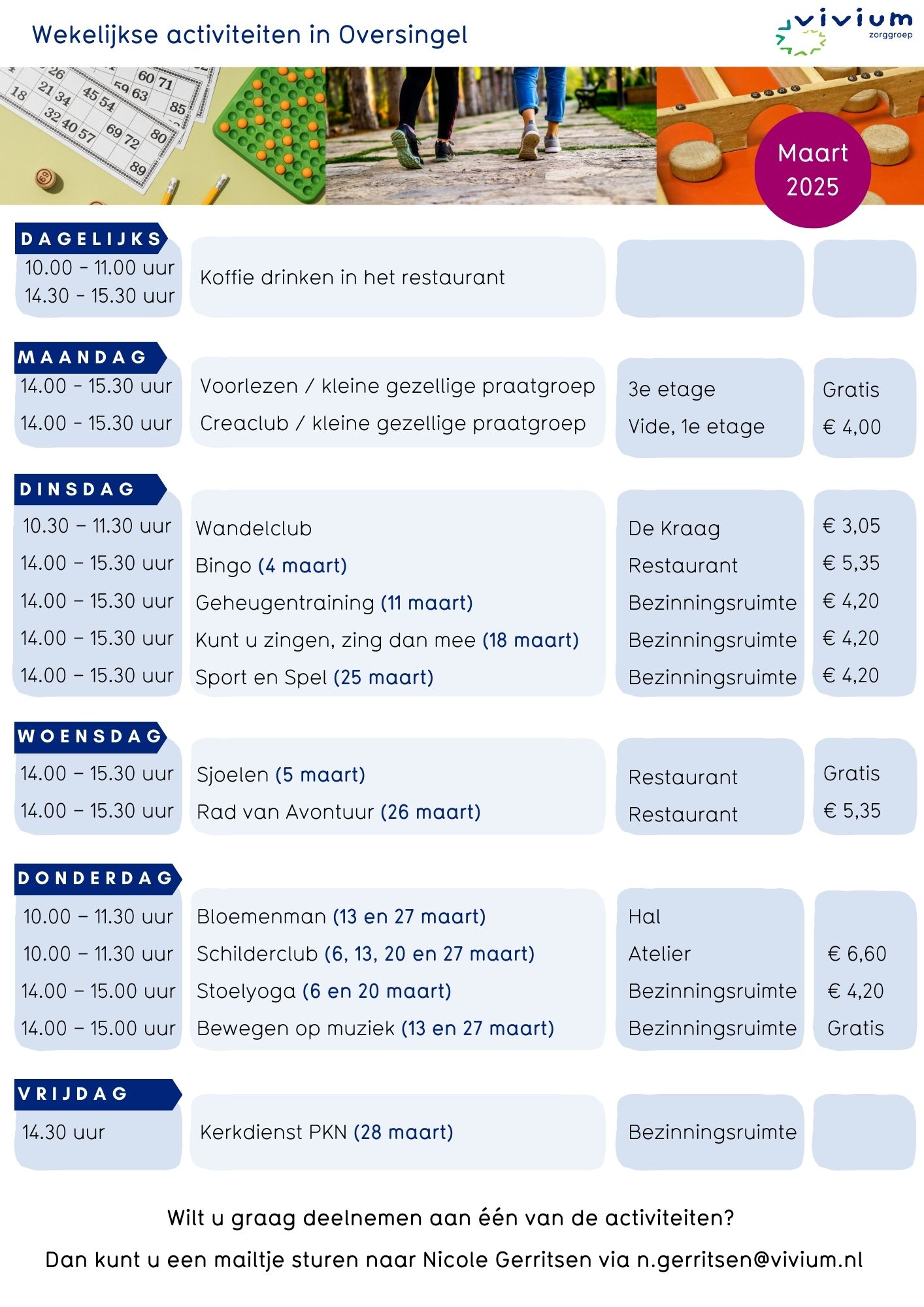 Voor meer informatie over het aanbod kijkt u in de Agenda of neemt u contact op met de medewerker Welzijn.