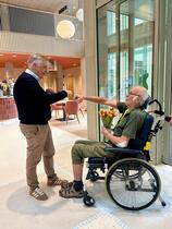 De eerste cliënt is in nieuw Naarderheem! Allereerst worden de cliënten van de Bloemenbuurt/BIZ-afdeling verhuisd. Vanmiddag volgen de cliënten van de eerste en tweede etage. Directeur Marco heet iedereen persoonlijk welkom vandaag en morgen. De eerste cliënt heeft een bosje bloemen gekregen.