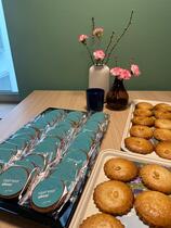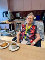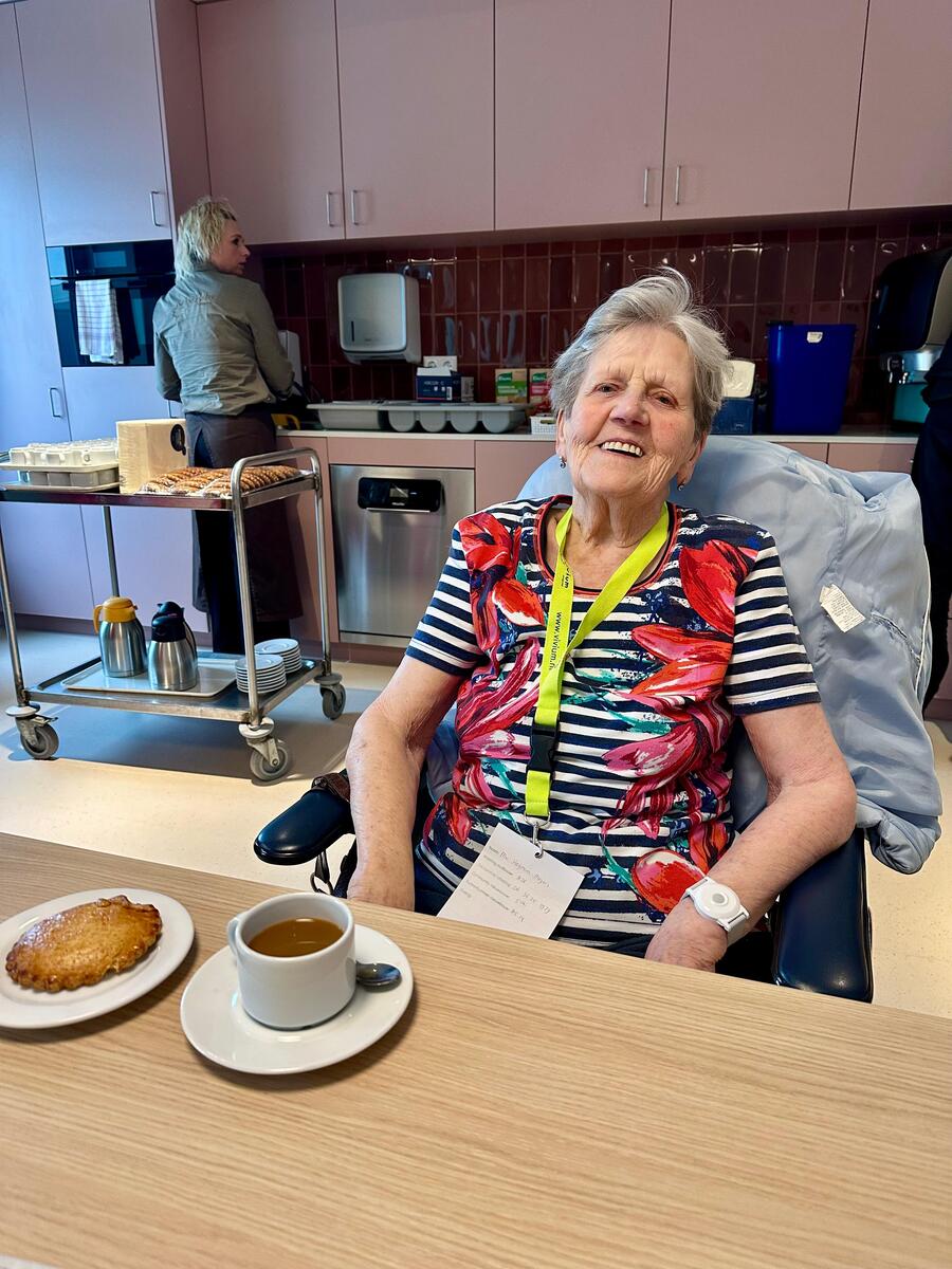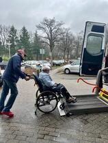 De eerste cliënt uit Blaricum die in het busje ging, Mw. Heijmans, is inmiddels in het trefpunt in de nieuwbouw gearriveerd en opgevangen met koffie en een gevulde koek.