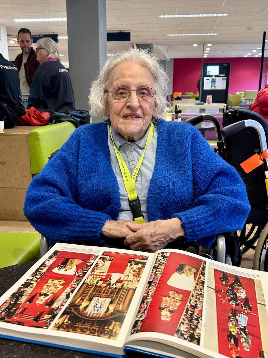 ''Mijn eerste indruk is goed, het gebouw is schitterend. Ik ben benieuwd naar mijn kamer. Ik mocht eigenlijk al naar huis, maar blijf toch nog even in Naarderheem. Ik Blaricum deelde ik mijn kamer met die mevrouw die nu tegenover mij zit; hier heb ik een eigen kamer. Dat had van mij eigenlijk niet gehoeven, want het was best gezellig samen. Maar we blijven samen koffie drinken en kletsen!"