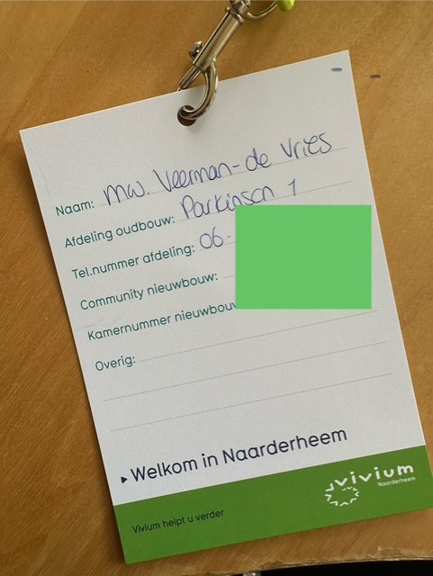 Alle cliënten krijgen een keycord met naamkaartje om. Op het kaartje staat hun naam, oude afdeling, het telefoonnummer van de afdeling, nieuwe afdeling en nieuw kamernummer. Indien nodig staat er ook andere belangrijke informatie op, bijvoorbeeld over medicatie. Zo heeft iedereen snel de juiste informatie bij de hand.