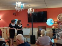 Op het moment dat we dit stukje schrijven zijn er op beide locaties optredens: Prof Russolo zingt samen met de bewoners van de Ruyterstraat vele liedjes. Klein en "intiem"in de huiskamer. Hier op de Bolder zit het restaurant nu stampvol!: De Meisjes van de Radio. Een vrolijk duo wat met hun "radio" allerlei liedjes de revue laten passeren. Dit optreden is mogelijk gemaakt in samenwerking met Alzheimer Nederland afdeling Gooi en vechtstreek. Een samenwerking die wellicht nog meer mogelijkheden gaat bieden in de toekomst.