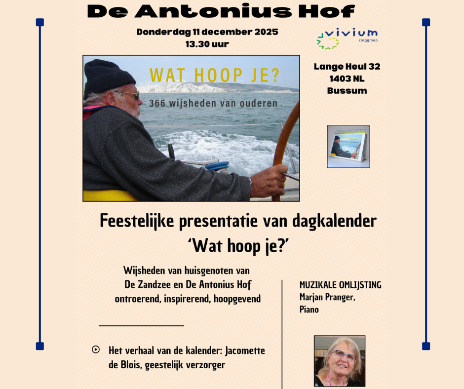 Op 11 december om 13:30 wordt er een feestelijke presentatie gehouden van de dagkalender op de Antonius Hof. Met muzikale omlijsting van Marjan Pranger. U bent van harte welkom.