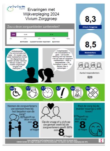 Eind 2024 heeft onder alle cliënten wijkverpleging en de Zorgeloos wonen locaties (1451 cliënten) een cliëntervaringsonderzoek plaatsgevonden. (PREM) Door 520 cliënten is de vragenlijst ingevuld retour gezonden. De resultaten zijn weergegeven in onderstaande infographic.